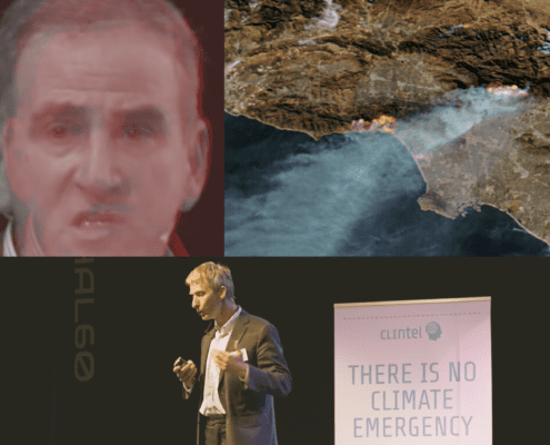 Beeld: Momus (Benny Peiser, boven, en Marcel Crok, beneden, in Clintel's YouTube videos. Rechtsboven: satellietbeelden van branden in Los Angeles, januari 2025, Wikimedia)